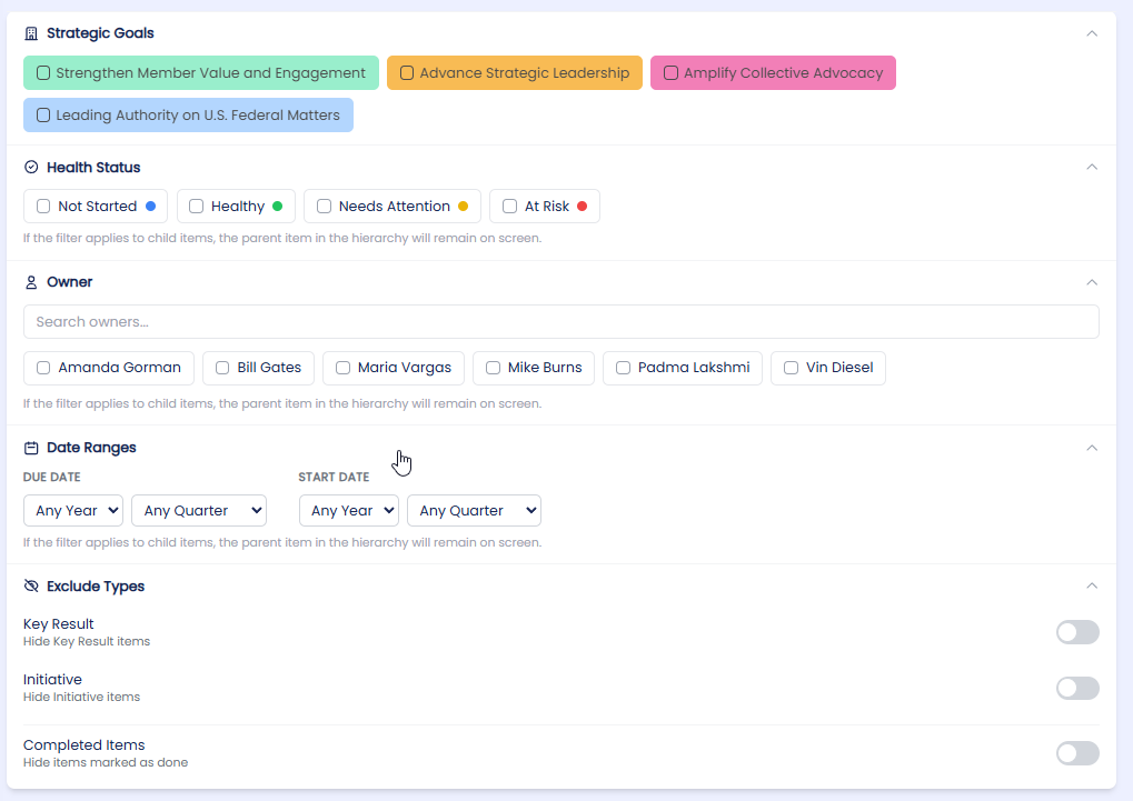 4. Filters apply instantly as you select them. Toggle them on and off to compare views in real time. When a child item matches your filter, its parent item will also appear on screen to keep the full context of your strategic plan visible.