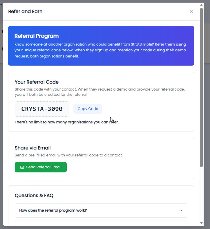 The easiest way to refer someone to StratSimple is from your homepage, go to the bottom left to this Refer and Earn, which will open the referrals screen. Then you can copy the code and send it. There is a unique referral link for every organization.